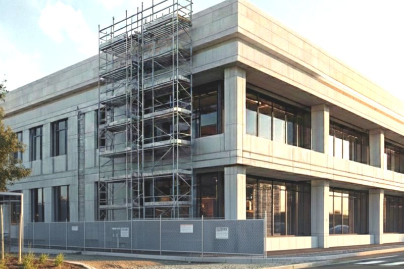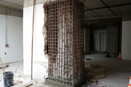 - Large commercial building renovation and retrofit construction site showing structural strengthening work on existing concrete