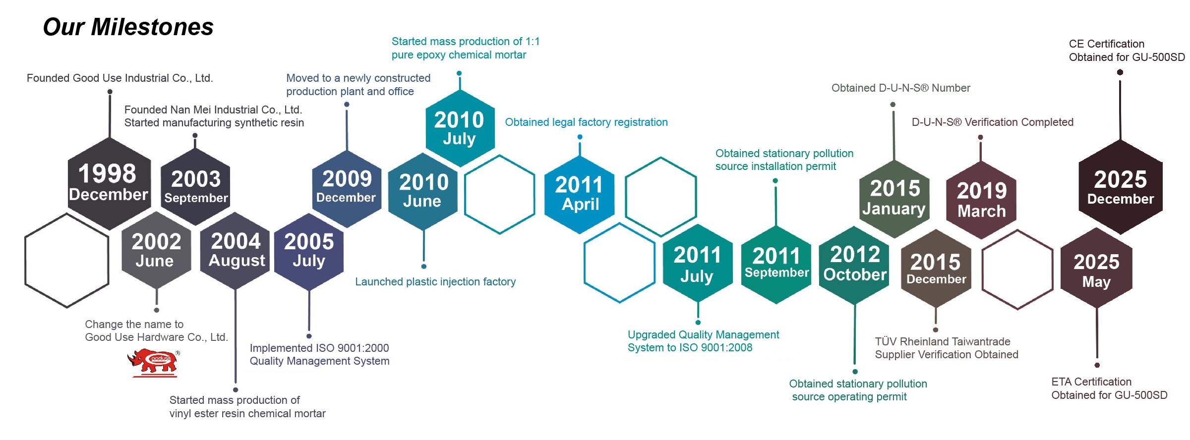 GOOD USE HARDWARE CO., LTD has over 28 years of professional experience in epoxy chemical anchors and is one of Taiwan's pioneering manufacturers specializing in the research and production of anchoring adhesives. From humble beginnings with limited resources, we have grown step by step into a well-established, reliable, and quality-focused manufacturing company. Along the way, we sincerely thank our global customers for their support and feedback on market trends, which have allowed us to continuously optimize our products and enhance our technical capabilities.